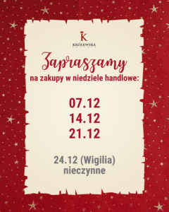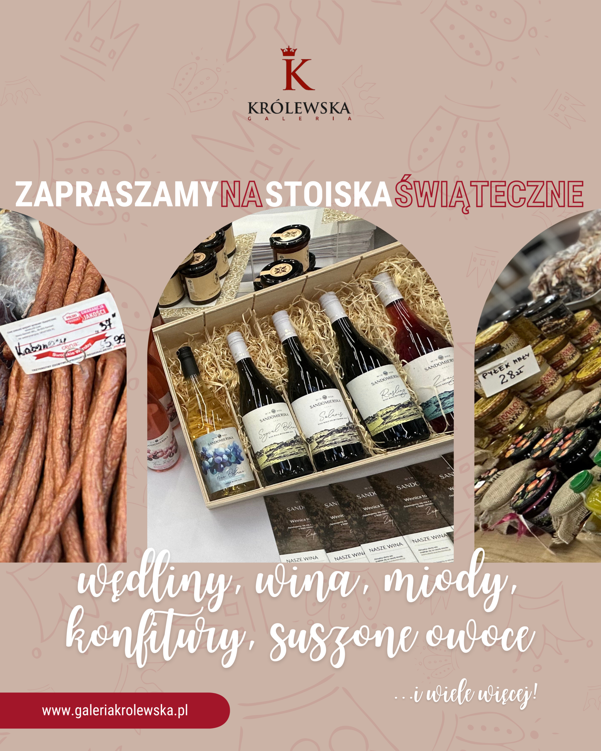 Świąteczne smaki w Galerii Królewskiej! 🎄 Świąteczny stół ma swój wyjątkowy charakter – pełen zapachów, tradycji i produktów, po które sięga się tylko o tej porze roku. W Galerii Królewskiej czekają na Was stoiska, dzięki którym skomponujecie świąteczne menu w królewskim stylu. Znajdziecie tu 🍖 tradycyjne wędliny i wyroby mięsne, 🍇 wyselekcjonowane wina, 🍯 naturalne miody, aromatyczne konfitury, 🍎 suszone owoce i wiele innych produktów, które tworzą smak prawdziwych świąt. Wszystko w jednym miejscu, od lokalnych dostawców i sprawdzonych producentów.
