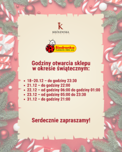 Szanowni Klienci! Uprzejmie informujemy, że w tygodniu świątecznym sklepy w pasażu Galerii Królewskiej czynne są w niezmienionych godzinach. Wyjątki stanowią sklepy Biedronka, Empik i Zakład Mięsny Ciak – obowiązują godziny podane we wcześniej opublikowanych wpisach. W sylwestra (31.12) sklepy są czynne w godzinach 9:00–16:00. Zapraszamy na zakupy! 🎄✨