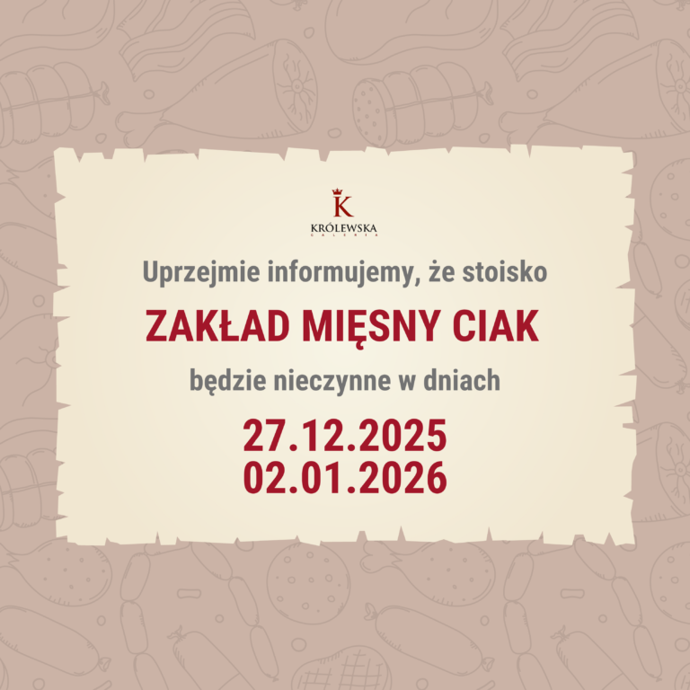 Uprzejmie informujemy, że stoisko Zakład Mięsny Ciak będzie nieczynne w dniach 27.12.2025 oraz 02.01.2026.